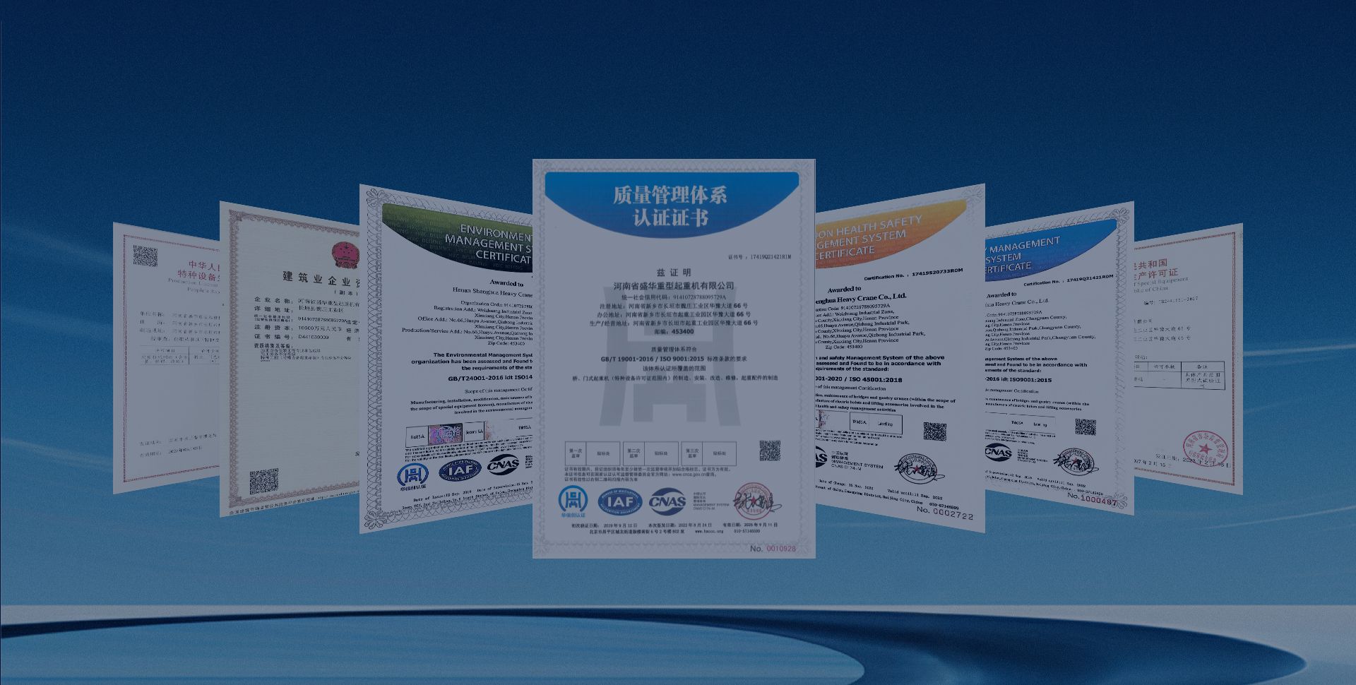 順利通過ISO系列國際認證,榮獲“中國知名起重機十佳品牌”等多項榮譽,手握十多項國家證書。從質量到環境,從健康到品牌,全方位資質認證